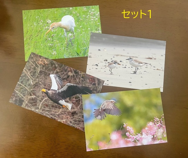野鳥の写真のポストカードです。 2セットからお選びいただけます セット1 アマサギ シロチドリ親子 オオワシ ヒヨドリ セット2 シロチドリ親子 シロチドリとちょうちょ 二羽のシロチドリ ミユビシギ 4種類のセットです。 上記の組み合わせ以外で、4枚ほしいよ!という希望があるばあいは、備考欄に種類をご記入ください。